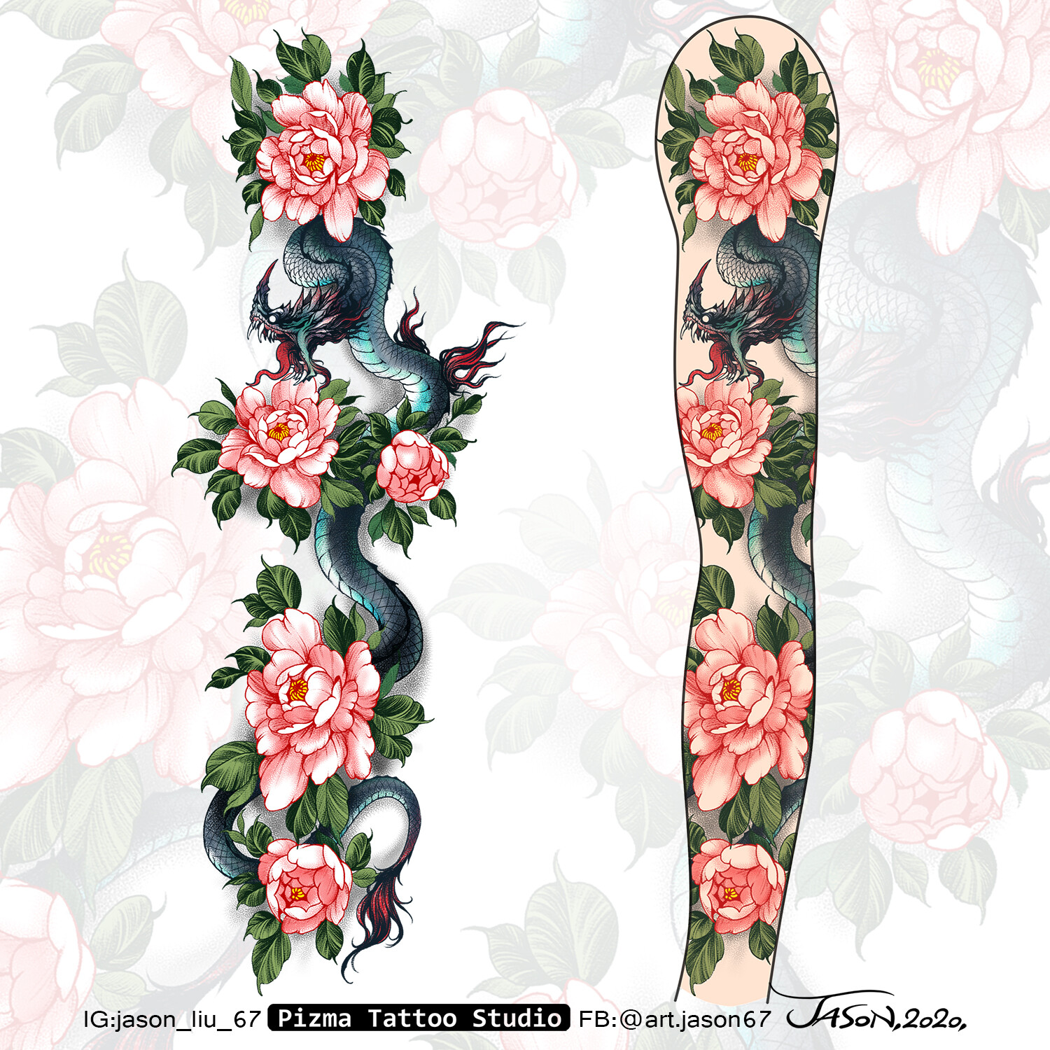 Artstation Tattoo Design The Naga Snake With Peony Flower All Sleeve